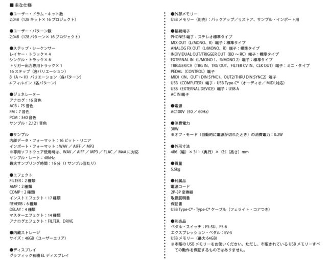 ●リズム・マシンとして約40年ぶりにアナログ音源を搭載。TR-808、TR-909から厳選した16種の回路を受け継ぎ、新たに開発されたエンジンは、パラメーターの新規追加や設定幅の拡張で、ヴィンテージ・サウンドはもちろん現代的で新しい表現も実現